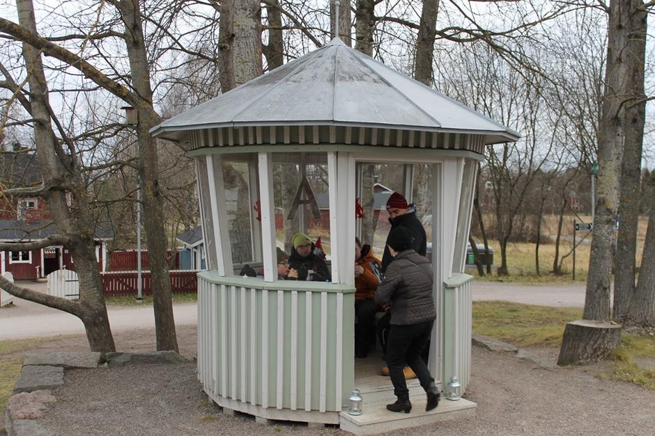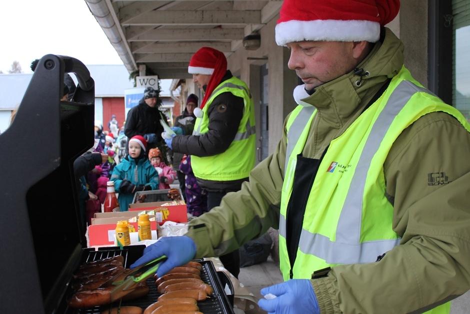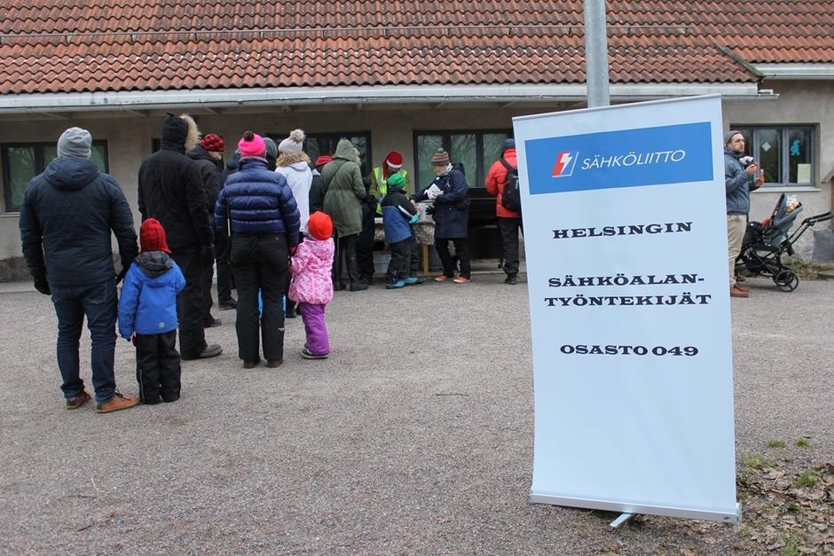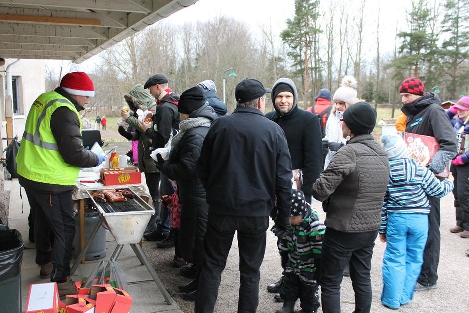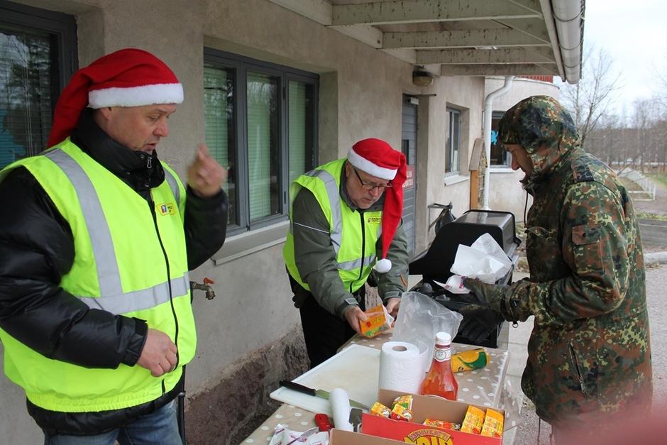 Osaston tarjoamat makkarat ja mehu maistuivat huvimajassa, tuulesta suojassa.